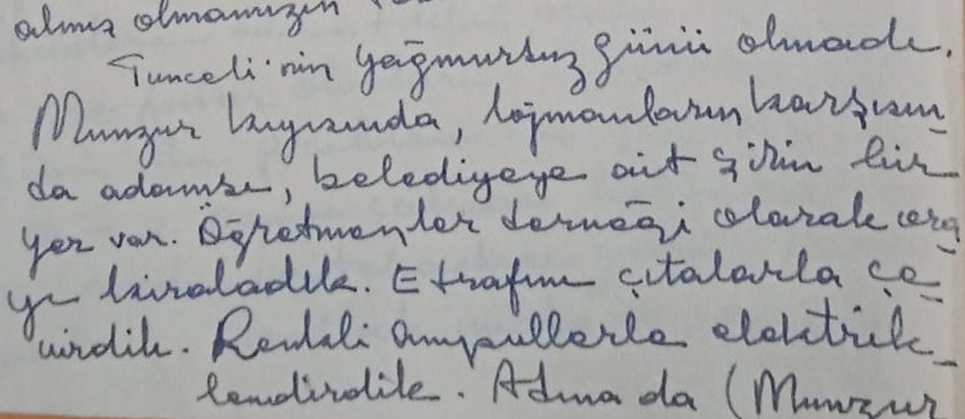 “Tunceli’nin yağmursuz günü olmadı. Munzur kıyısında, lojmanların karşısında adamsı, belediyeye ait şirin bir yer var. Öğretmenler derneği olarak orayı kiraladık. Etrafını çıtalarla çevirdik. Renkli ampullarla elektriklendirdik. Adına da (Munzur Aile Bahçesi) dedik. Büfe ve bir de çay ocağı kurduk. Bir haftaya kadar faaliyete geçireceğiz. Belediyeden seneliği 150 liraya aldık. İşten anlıyanlar belediyeye müracaat etmiş; biz 1500 lira veririz, bize verin diye. Sevindik tabi. Bizim maksadımız da buydu. Örnek vermek. Bir baştan bir başa aynı kıymette olan Munzur kıyısının, insan eli değince değerlendirilmesini sağlamak….”