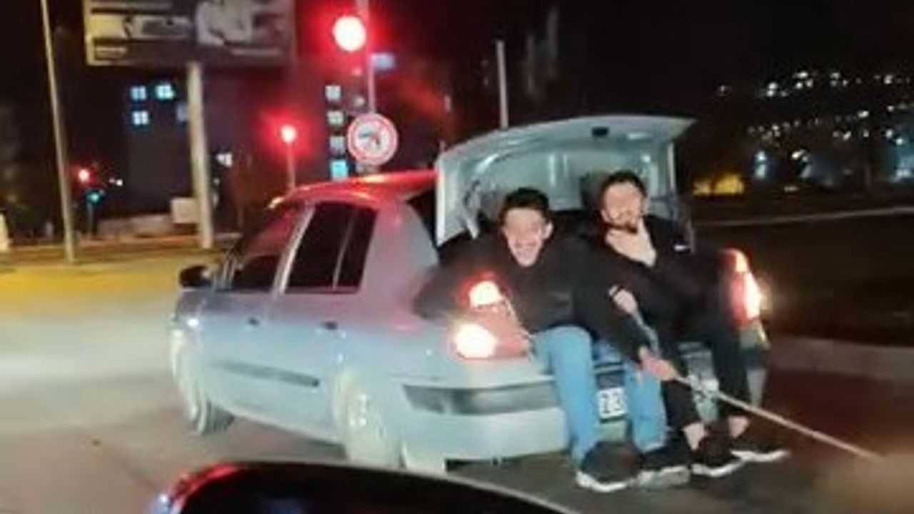 Elazığ’da bir aracın bagaj kısmını oturan 2 kişi, arızalanan TOFAŞ Doğanı iple çekti.