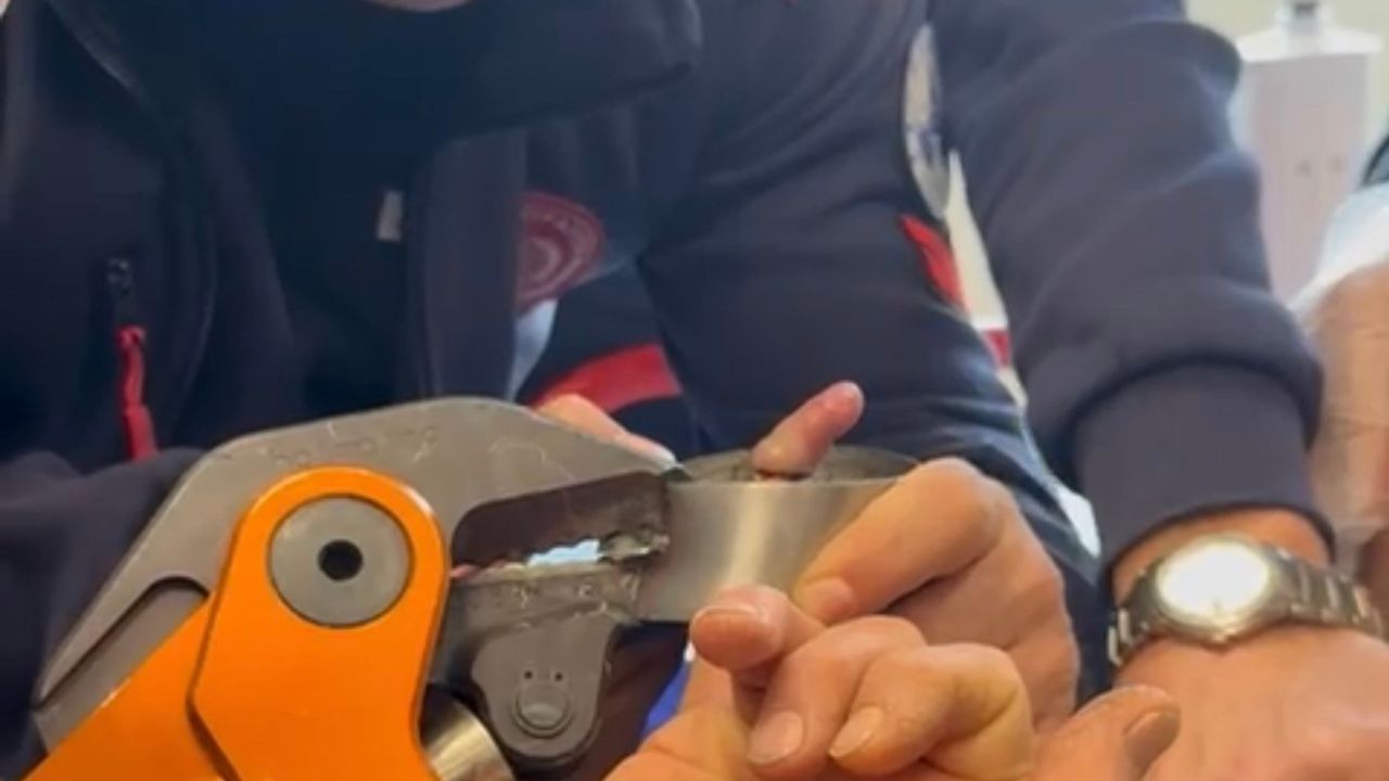 Elazığ'da parmağı çelik küllüğün deliğine sıkışan bebeğin imdadına itfaiye ekipleri yetişti. Hastanede ayırıcı ile küllük kesilerek bebeğin parmağı çıkarıldı.