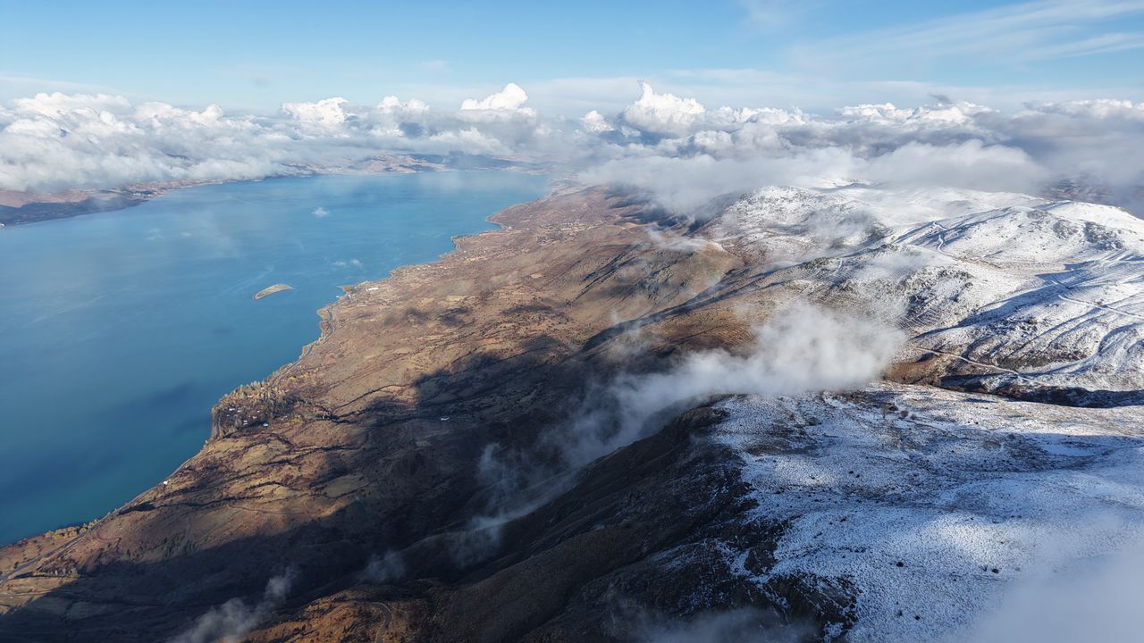 Elazığ'da karla kaplı Hazarbaba Dağı ve eteğindeki Hazar Gölü, bulutlarla birlikte kartpostallık görüntüler oluşturdu.