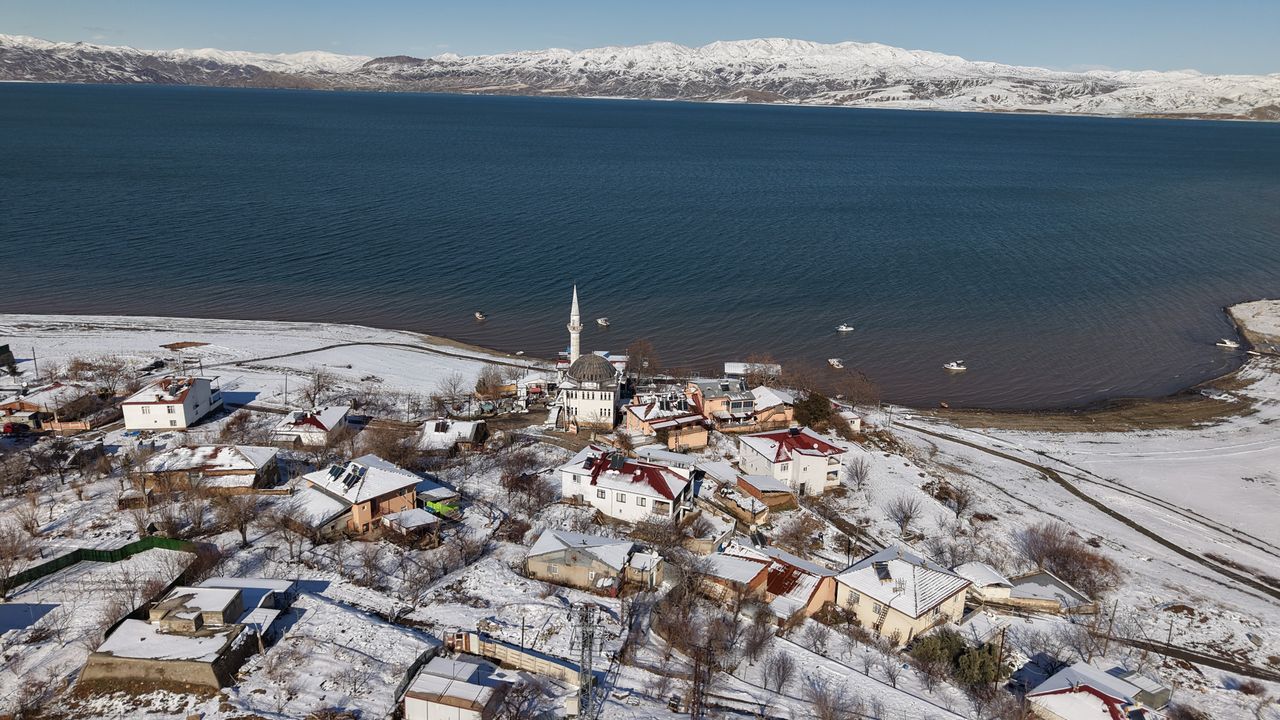 Elazığ'da Keban Baraj Gölü havzasında yer alan Aşağı İçme köyü, baraj suyu ve kar görüntüsüyle ortaya eşsiz manzaralar sundu.
