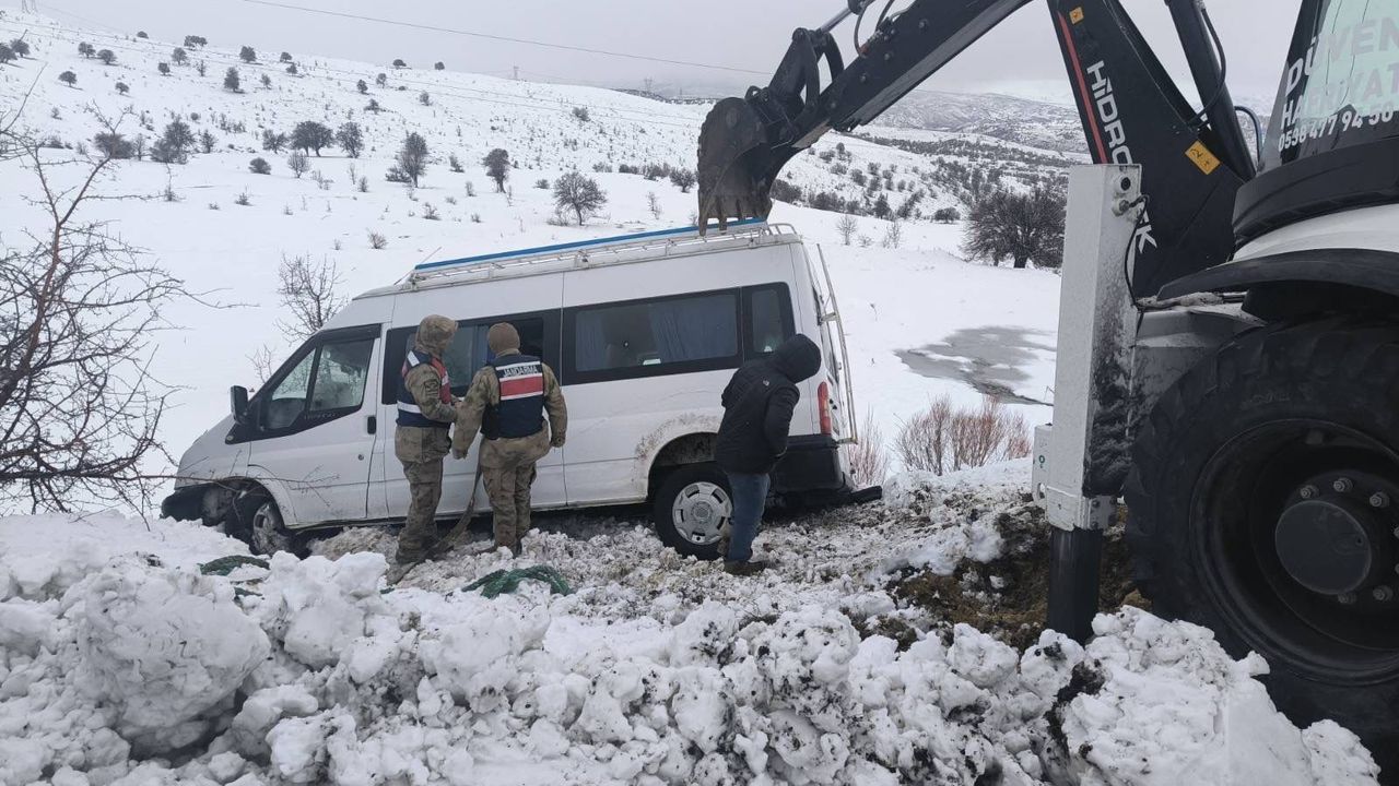 Elazığ’da yoğun kar yağışından dolayı şarampole sürüklenen minibüs, jandarma ve il özel idaresi ekipleri tarafından kurtarıldı.