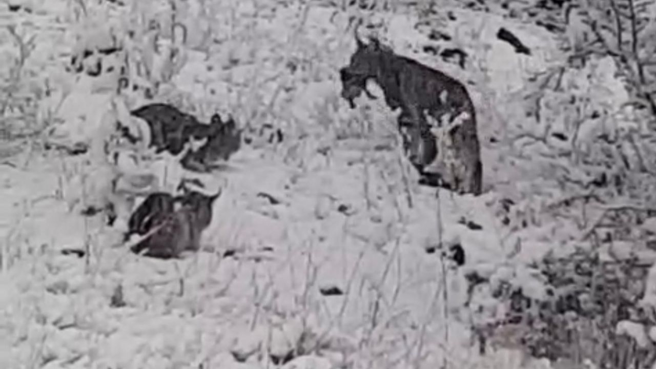 Elazığ'da avladığı kekliği yiyen vaşak ailesi kameralara yansıdı.
